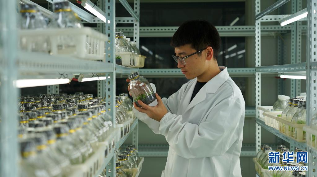 5月7日,在秦嶺花世界現(xiàn)代農(nóng)業(yè)園區(qū),組培研發(fā)中心主任張昌明在查看蝴蝶蘭苗的長勢。