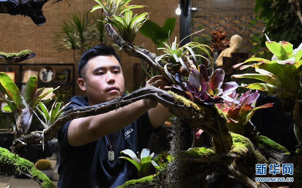 5月7日,在秦嶺花世界現(xiàn)代農(nóng)業(yè)園區(qū),陜西芭蕉扇園林綠化有限公司總經(jīng)理高杉在打理景觀生態(tài)缸。