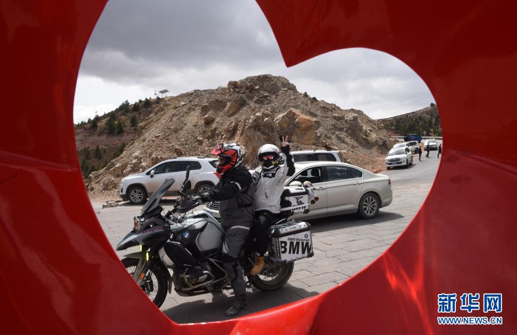 在西藏芒康縣拉烏山,一對騎行摩托的年輕人準備出發(5月2日攝)。