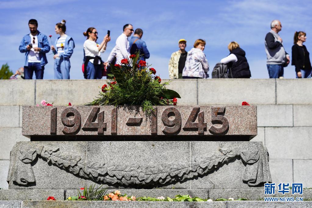 5月9日,人們在德國首都柏林的特雷普托蘇軍烈士陵園駐足。