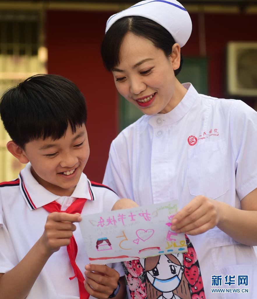5月11日,河北省滄州市新華區車站小學學生為滄州市人民醫院的護士阿姨送上美術作品,表達敬意。