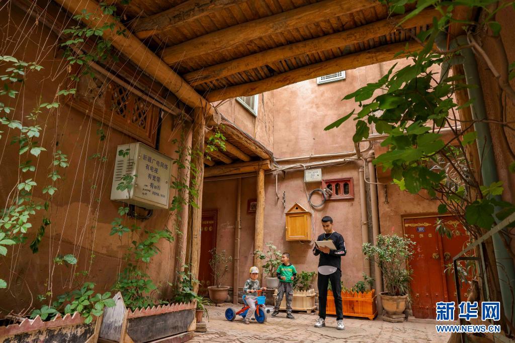 麥麥提吐爾遜江·麥麥提依明在新疆喀什古城景區(qū)的小巷內(nèi)進行速寫創(chuàng)作,兩名小朋友好奇上前圍觀(5月6日攝)。新華社記者 胡虎虎 攝