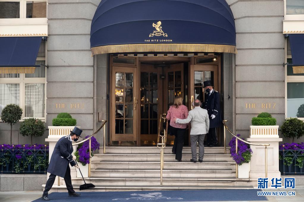 5月17日,工作人員在英國倫敦一家酒店門前迎接顧客。