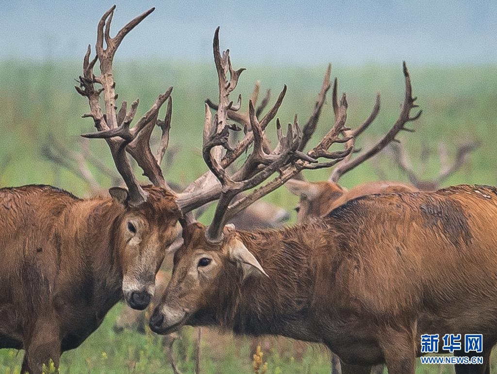5月17日,麋鹿在石首麋鹿國家級自然保護區內活動。新華社記者 肖藝九 攝