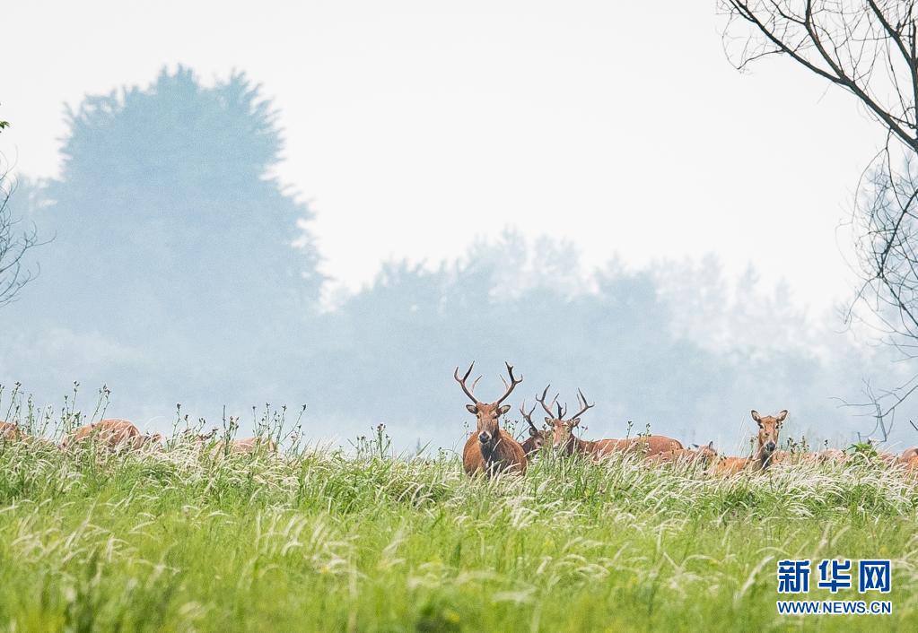 5月17日,一群麋鹿在石首麋鹿國家級自然保護區內活動。新華社記者 肖藝九 攝