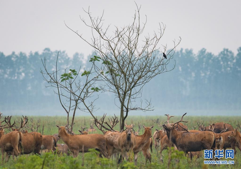 5月17日,一群麋鹿在石首麋鹿國家級自然保護區內活動。新華社記者 肖藝九 攝