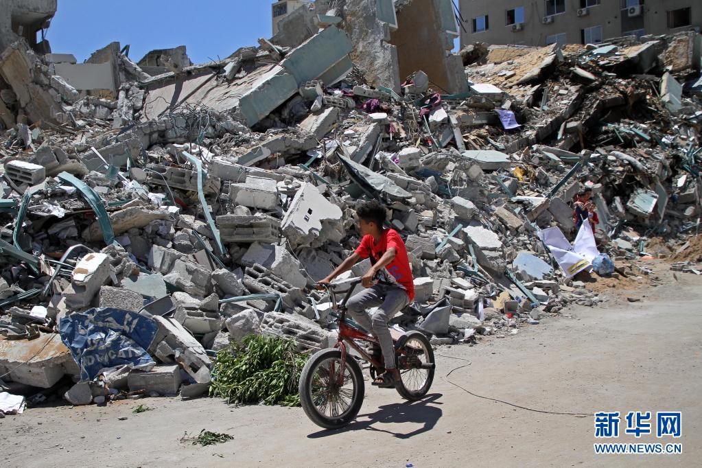 5月23日,一個男孩在加沙城騎車經過遭以軍空襲損毀的賈拉塔。5月10日以來,以色列與加沙地帶武裝組織之間爆發嚴重沖突。20日晚,哈馬斯與以色列方面各自宣布,雙方已達成停火協議,停火從21日凌晨開始。新華社發(里澤克·阿卜杜勒·賈瓦德攝)