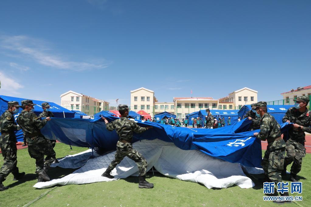 5月24日,武警青海總隊(duì)果洛支隊(duì)機(jī)動(dòng)大隊(duì)官兵為花石峽鎮(zhèn)藏文中心寄宿制小學(xué)搭建帳篷教室。新華社記者 劉芳 攝