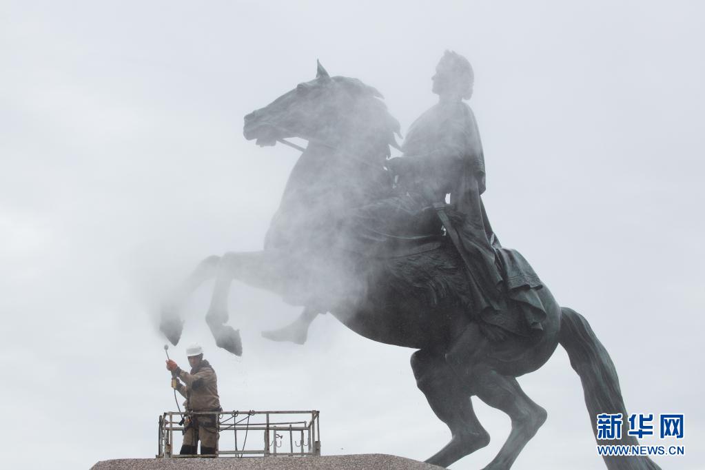 當日,圣彼得堡市政府的工作人員把彼得大帝“青銅騎士”的雕像清潔一新。圣彼得堡于1703年由彼得大帝奠基,今年的5月27日是圣彼得堡建城318周年紀念日。
