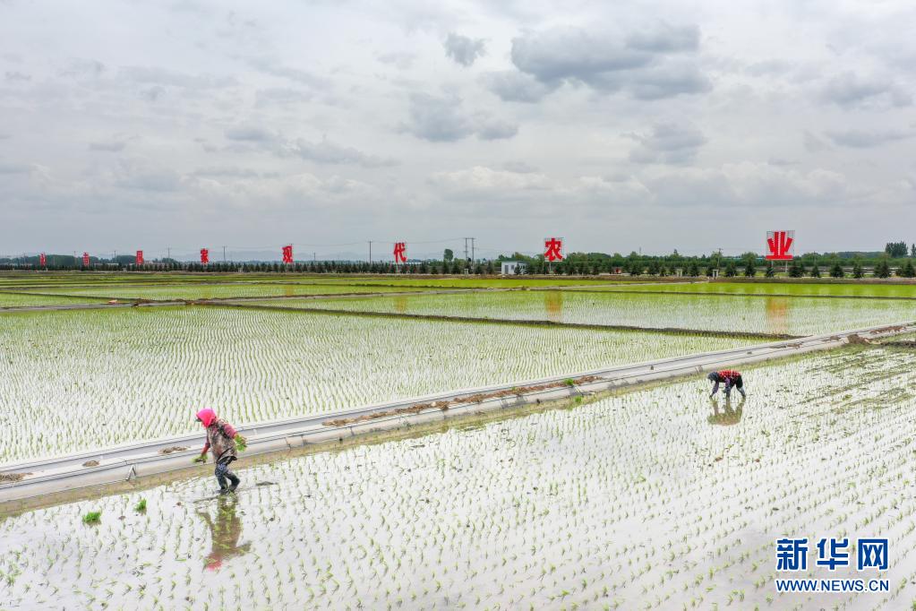 5月26日,在吉林省吉林市永吉縣萬昌鎮(zhèn)宇豐米業(yè)2萬畝高標(biāo)準(zhǔn)水田基地,農(nóng)民進(jìn)行水稻補(bǔ)苗工作(無人機(jī)照片)。