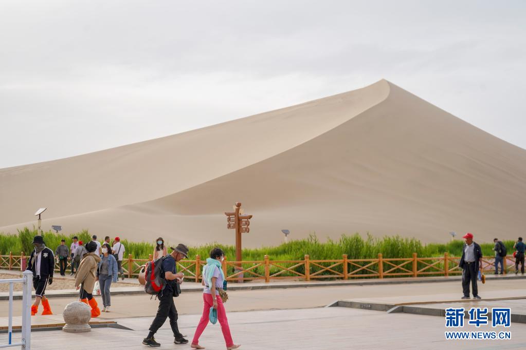 5月30日,游客在月牙泉畔觀光。