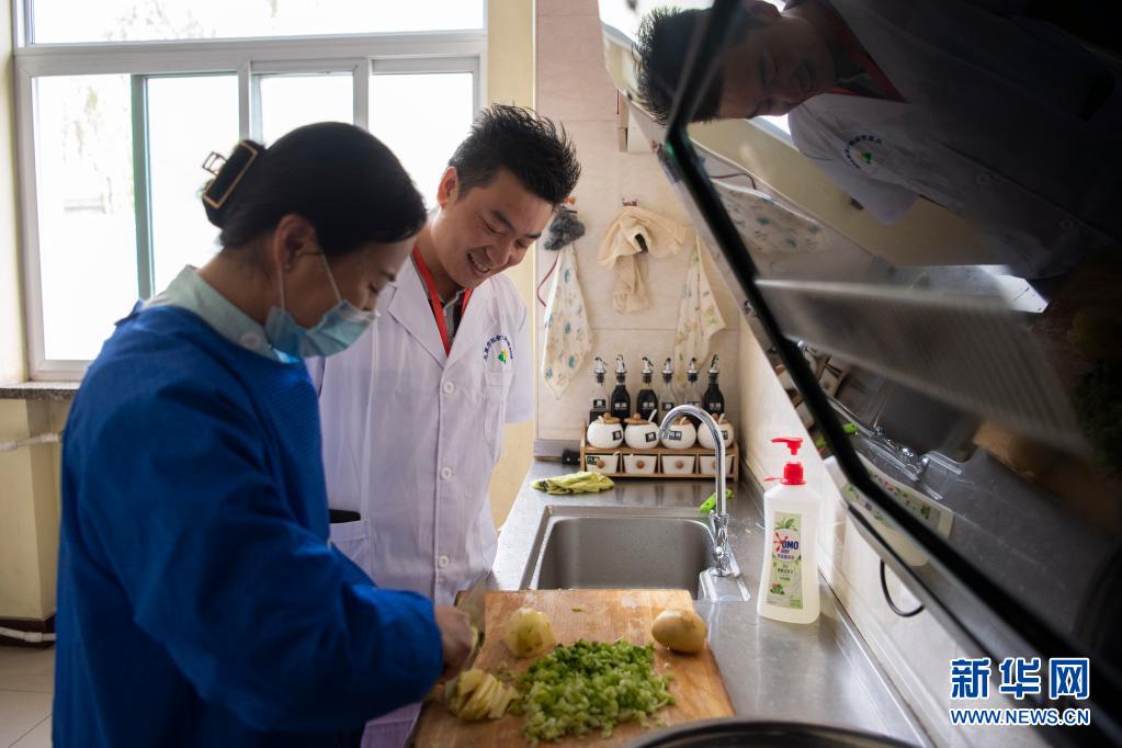 在太原市社會(兒童)福利院,黨龍祥(右)在廚房查看孩子們的輔食準(zhǔn)備情況(5月26日攝)。新華社記者 楊晨光 攝