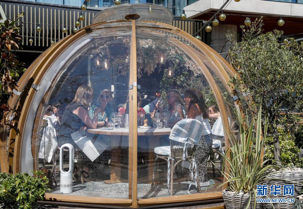 6月1日,人們在英國倫敦一家餐廳戶外就餐區(qū)的“泡泡屋”就餐。