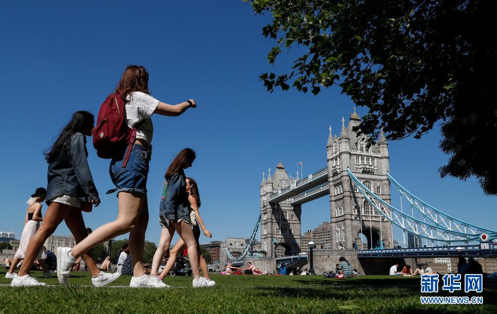 6月1日,人們從英國倫敦泰晤士河南岸的草坪上走過。