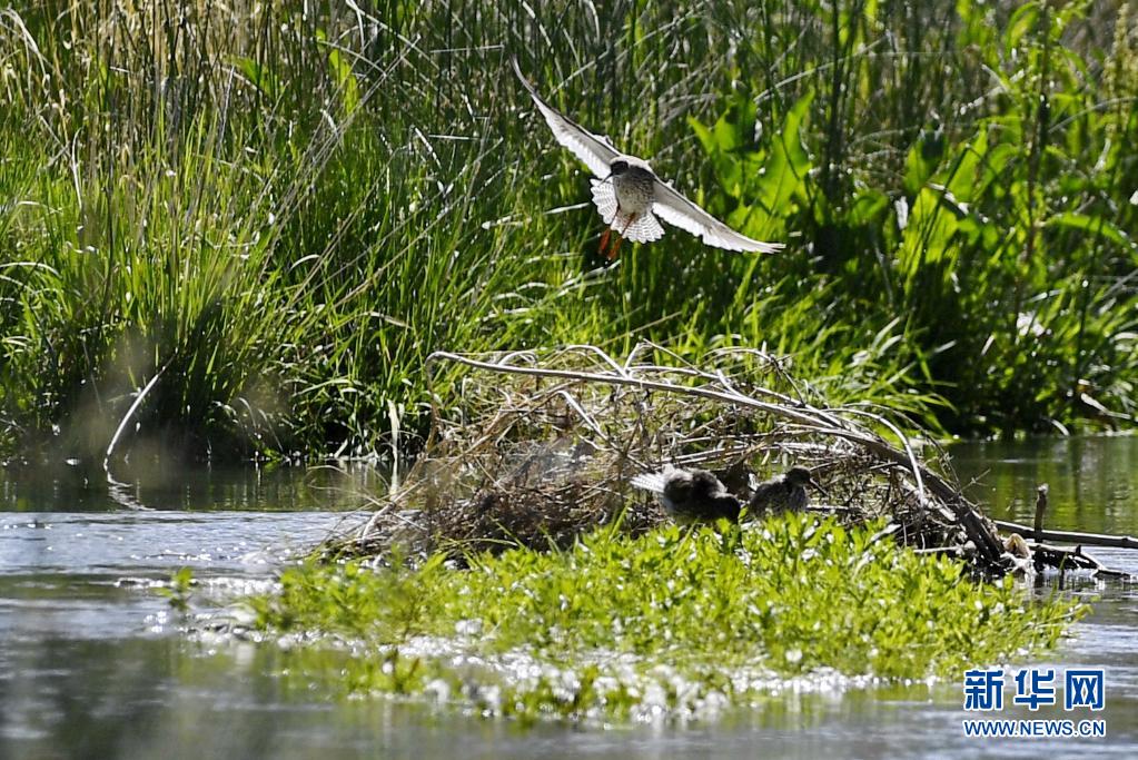 初夏,紅腳鷸在位于西藏拉薩的拉魯濕地國家級自然保護區內起舞覓食。