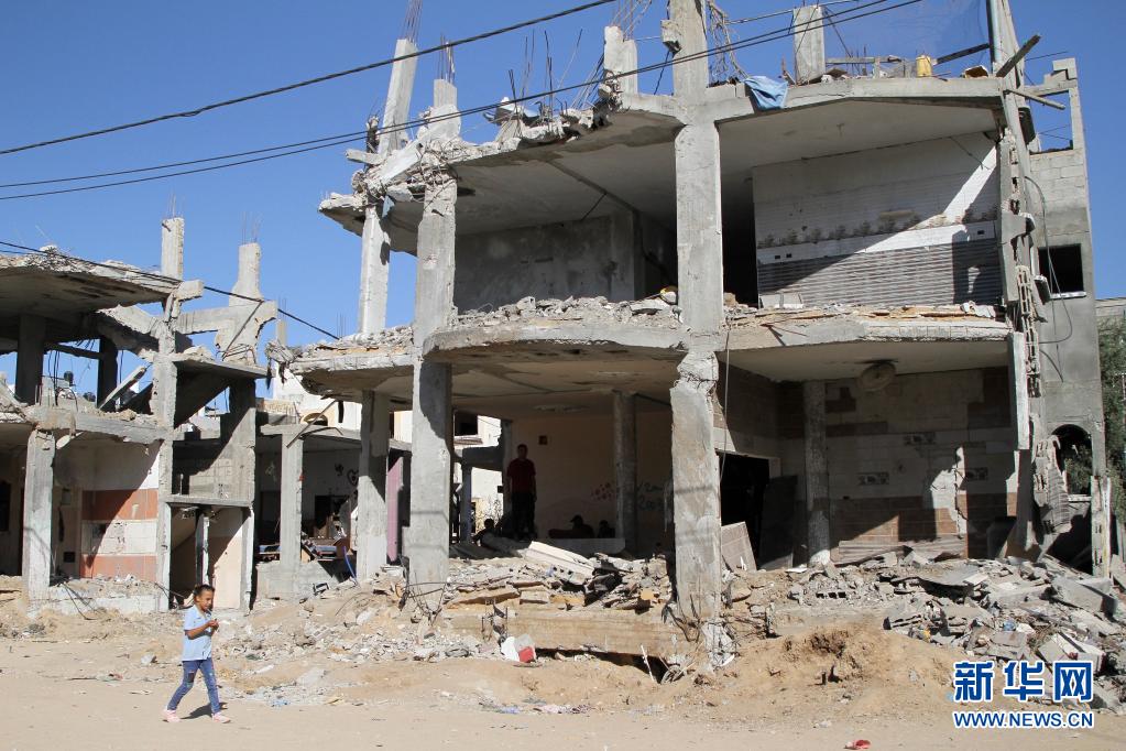 6月7日,一名巴勒斯坦兒童走過加沙地帶北部拜特哈嫩遭以軍空襲損毀的建筑。