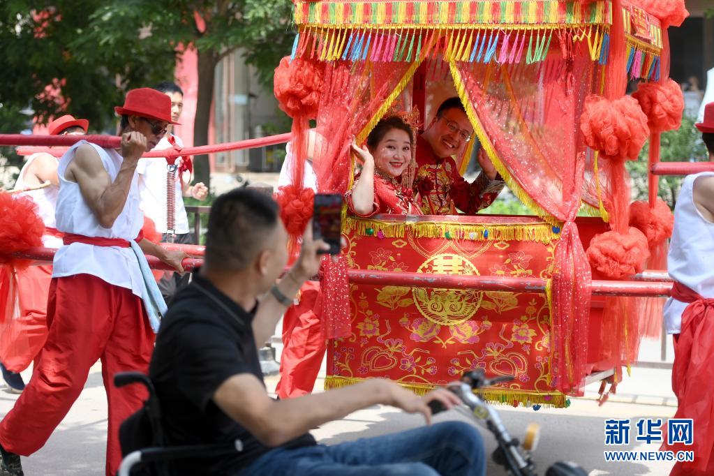 新郎周海云和新娘關美乘坐花轎前往婚禮儀式現場(6月15日攝)。新華社發(劉亮亮攝)