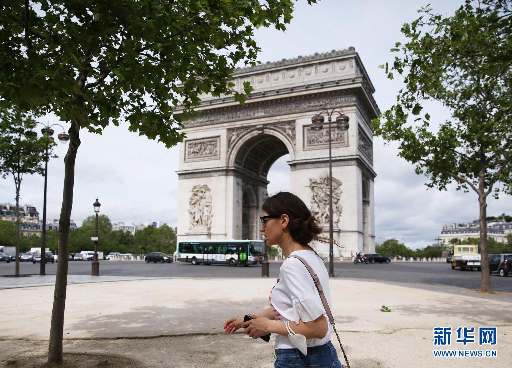 6月17日,一名女子手拎口罩走過法國巴黎凱旋門。