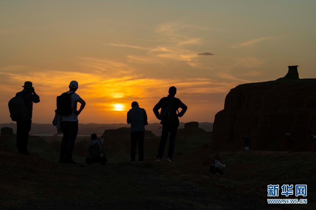 游客在新疆克拉瑪依烏爾禾世界魔鬼城景區(qū)欣賞日落(6月21日攝)。