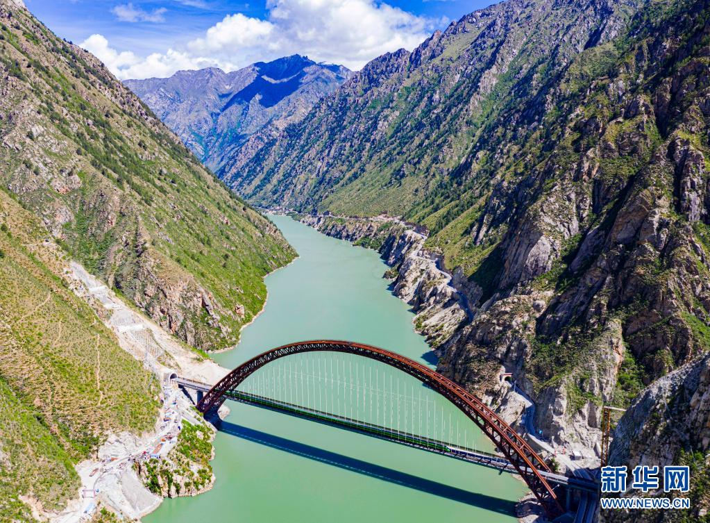 試運行的復(fù)興號列車行駛在藏木特大橋(6月17日攝,無人機照片)。