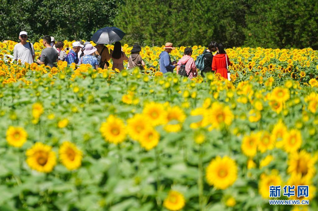 7月4日,游客在北京奧林匹克森林公園北園觀賞向日葵。