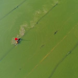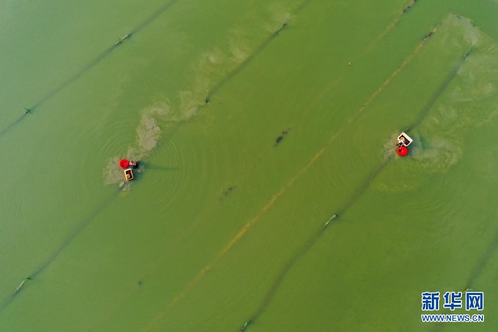 7月5日,在湖南省永州市道縣蚣壩鎮(zhèn)洲背村,村民在收獲小龍蝦(無人機(jī)照片)。