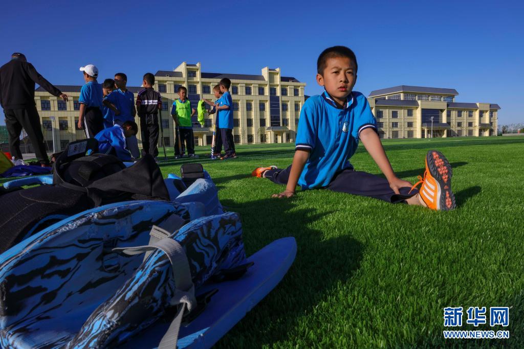 塔城市第二小學(xué)曲棍球隊(duì)的小隊(duì)員在訓(xùn)練賽前拉伸身體,準(zhǔn)備上場(6月13日攝)。