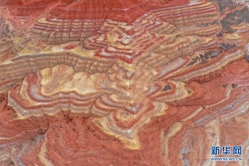 張掖世界地質公園一處彩色丘陵地貌呈現出“五彩祥云”景象(7月14日攝,無人機照片)。