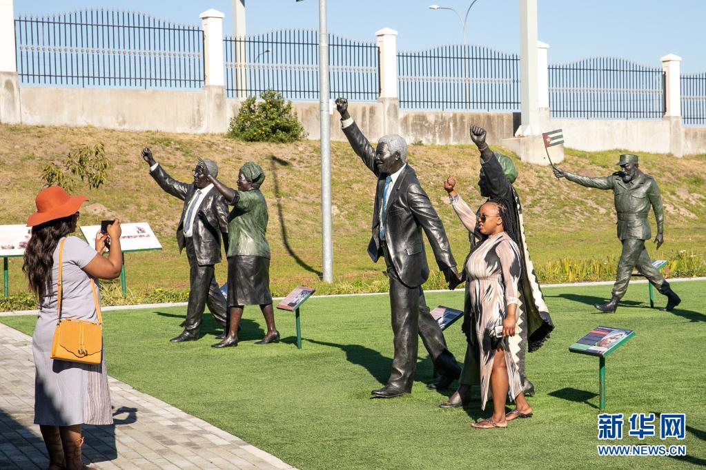 7月18日,在南非開普敦,一名游客和南非前總統納爾遜·曼德拉及其夫人溫妮·馬迪基澤拉-曼德拉的銅像合影。
