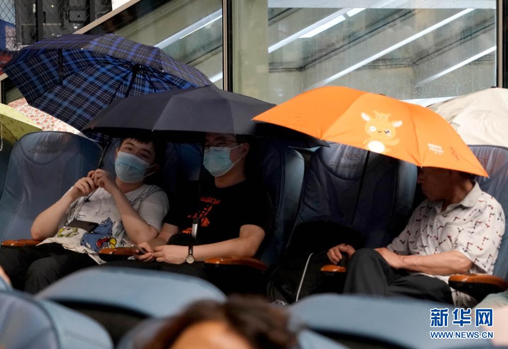 7月20日,旅客滯留在鄭州東站。候車廳出現漏雨情況,旅客撐傘擋雨。