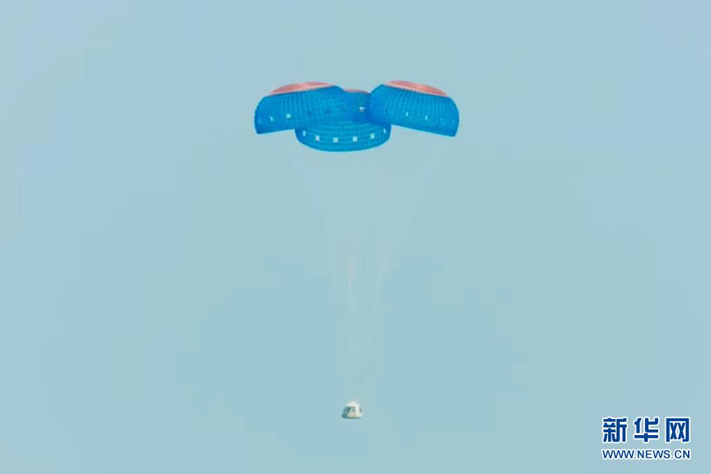 這張美國藍色起源公司7月20日發布的視頻截圖顯示“新謝潑德”飛行器在美國得克薩斯州西部降落。