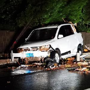7月21日在310國道米河鎮段拍攝的一輛因洪水損壞的汽車。