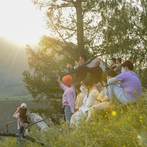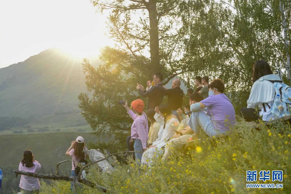 7月23日,游客在觀景臺上拍攝禾木村的落日。