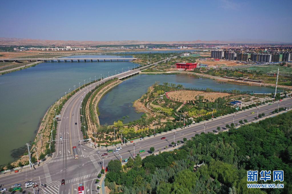 環繞著寧夏吳忠市同心縣縣城的清水河水系(6月22日攝,無人機照片)。新華社記者 王鵬 攝