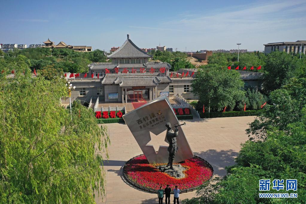 寧夏吳忠市同心縣紅軍西征紀念館前的“抗戰之聲”小號手雕塑(6月22日攝,無人機照片)。新華社記者 王鵬 攝