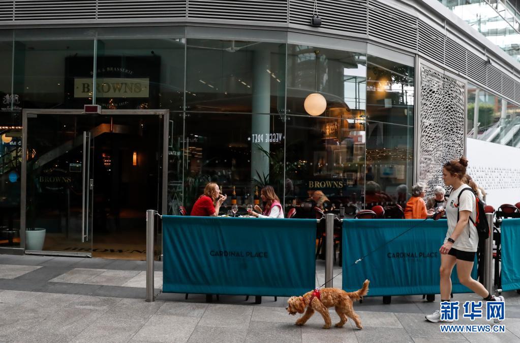 7月26日,人們坐在英國倫敦維多利亞一家餐廳的戶外餐飲區。