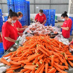 8月1日,在位于長(zhǎng)沙市望城區(qū)的湖南高星物流園,蔬菜倉(cāng)庫(kù)的工作人員在分揀胡蘿卜。