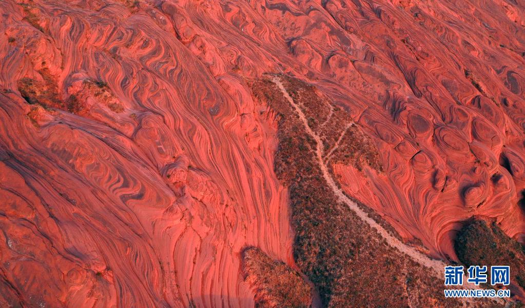 8月6日,朝霞映照下的靖邊縣龍洲鎮波浪谷丹霞景區(無人機照片)。