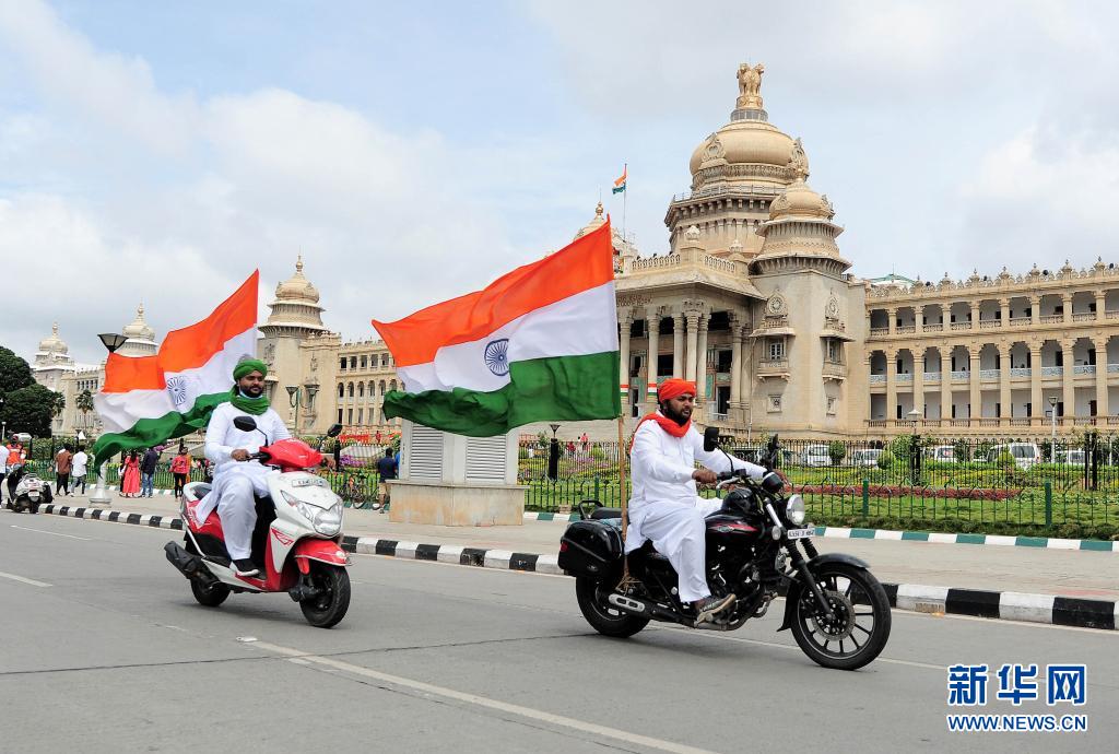 8月15日,人們在印度班加羅爾展示印度國旗,慶祝獨立日。