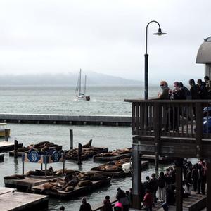 8月15日,人們在美國舊金山海邊觀看海獅。