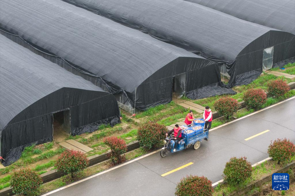 3月17日,在湖南省长沙市望城区靖港镇采丰蘑菇种植园,村民运输刚采摘的姬松茸(无人机照片)。