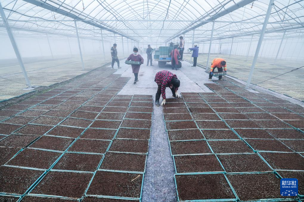 3月17日,慈溪市腾丰省级现代化农事服务中心的工作人员把出芽的育秧盘运送到育秧大棚内。