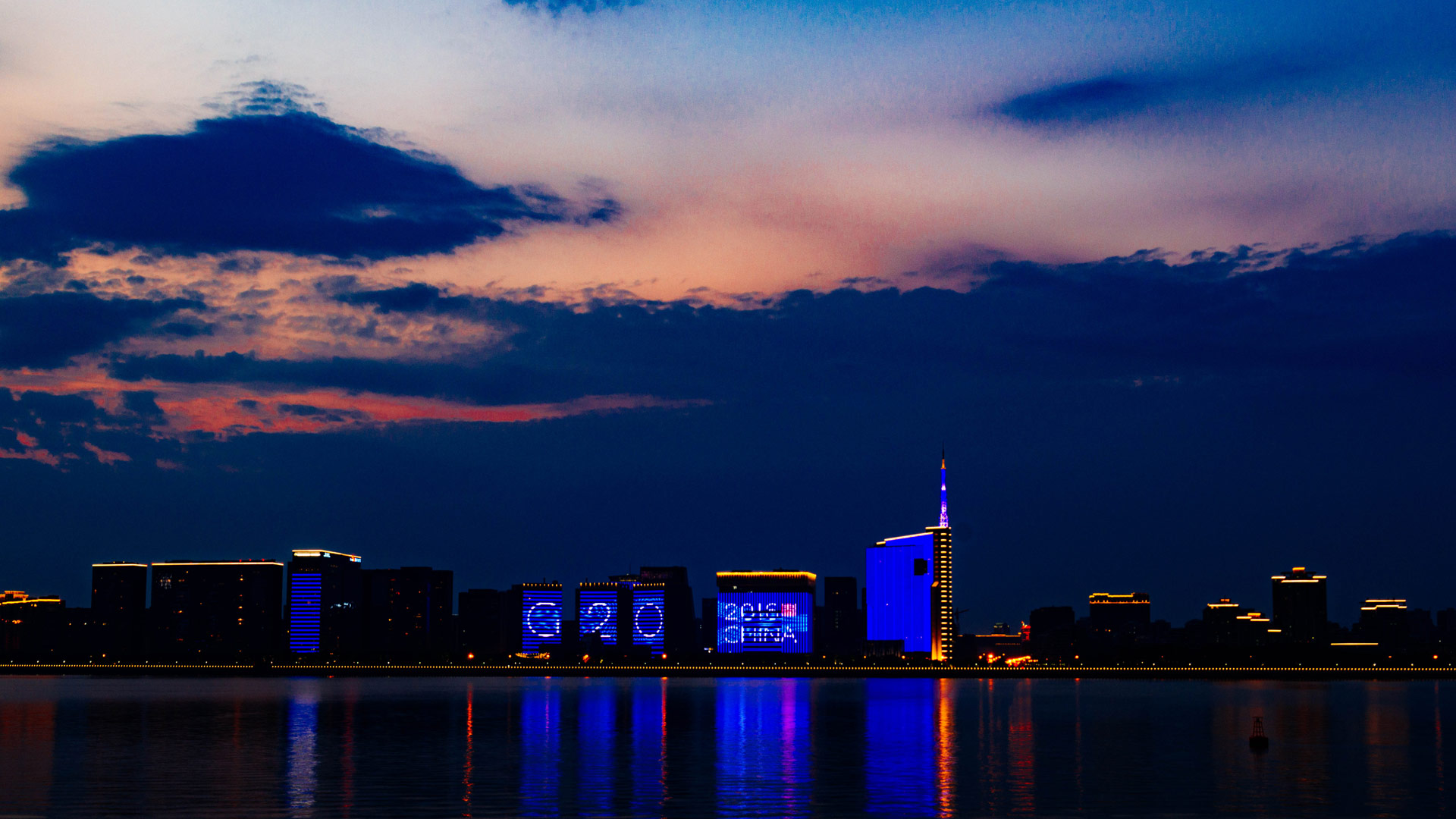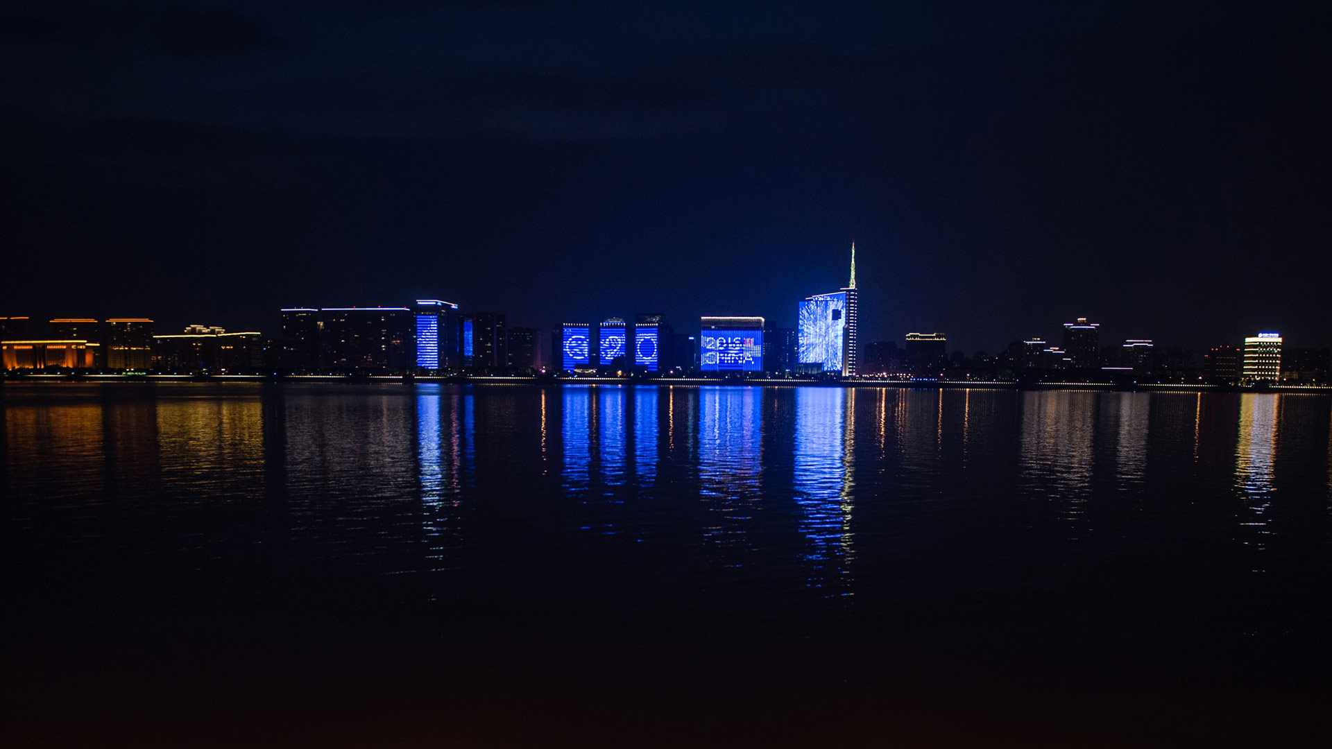 杭州錢塘江岸邊建筑的主題燈光秀(8月31日攝)。新華社記者李響攝