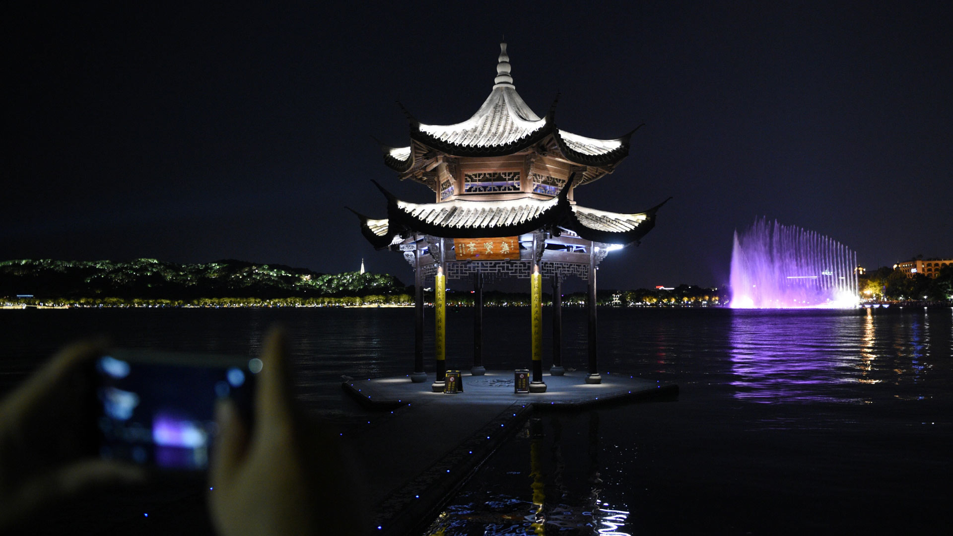 8月26日,行人在杭州西湖白堤上拍攝保俶塔夜景。新華社記者張鋮攝