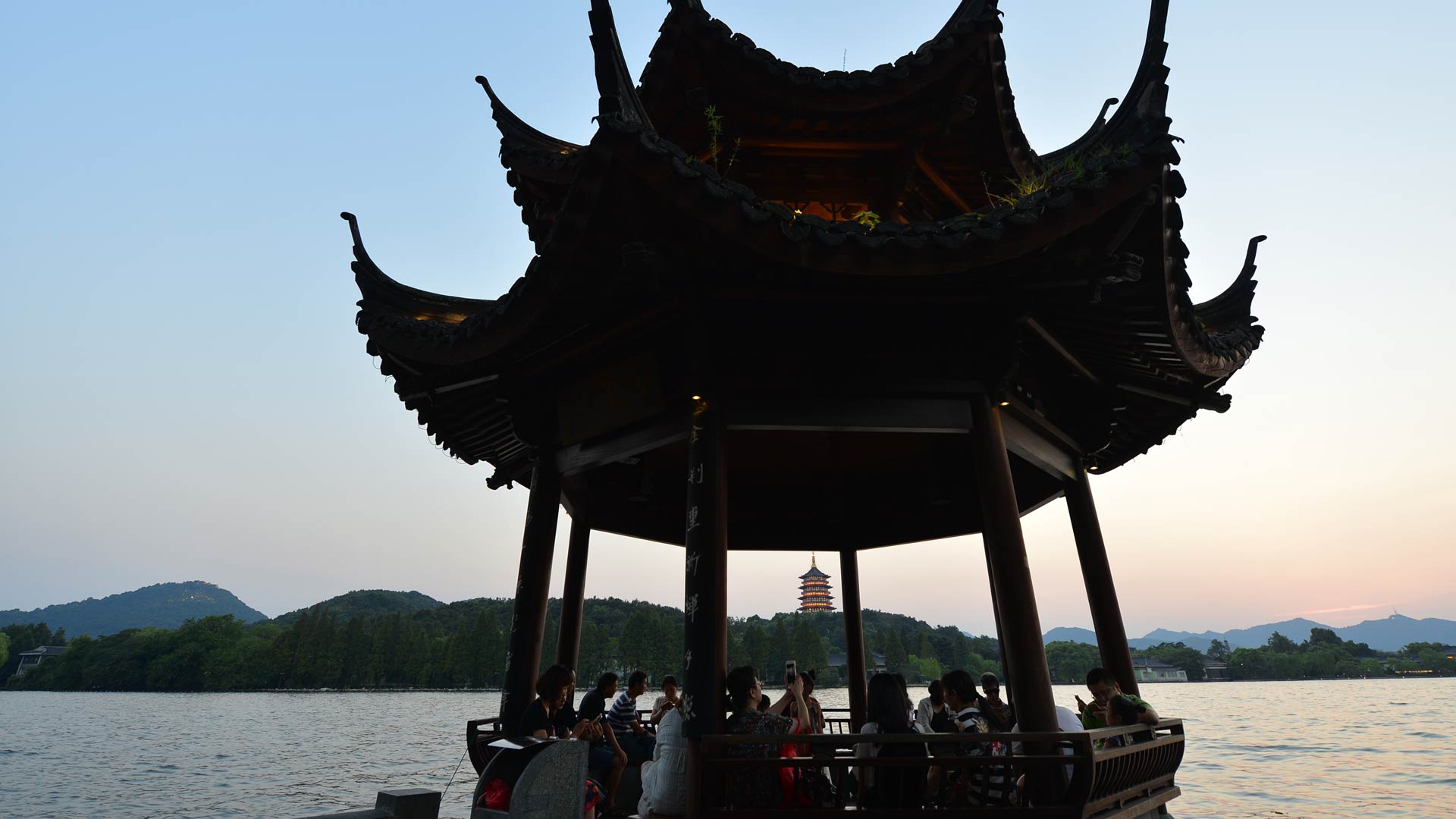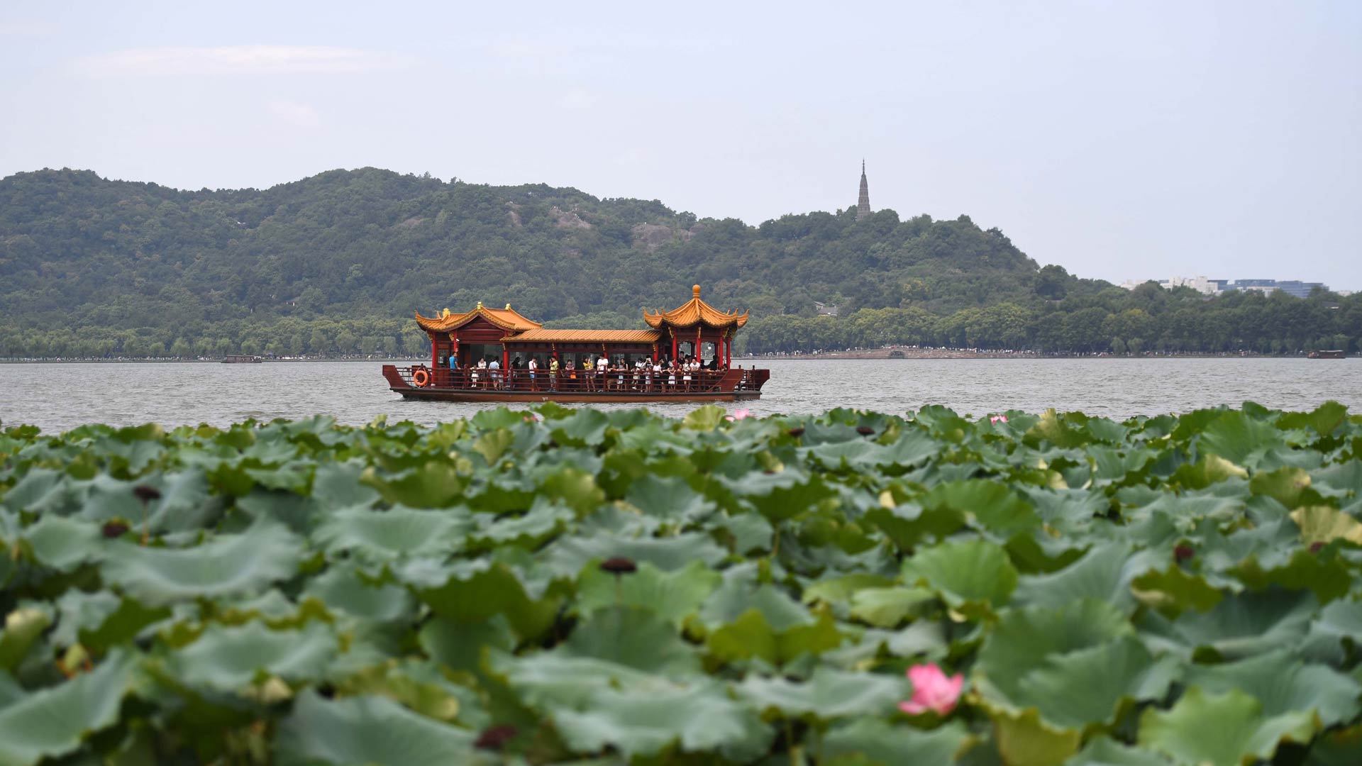 游客乘坐游船在西湖上游覽(8月27日攝)。 “三面云山一面城”,西湖的美麗自古就為眾多的作家和藝術(shù)家所稱頌。“西湖十景”被認(rèn)為是“天人合一”最理想最經(jīng)典的景觀體現(xiàn)。(新華社記者 陳曄華 攝)