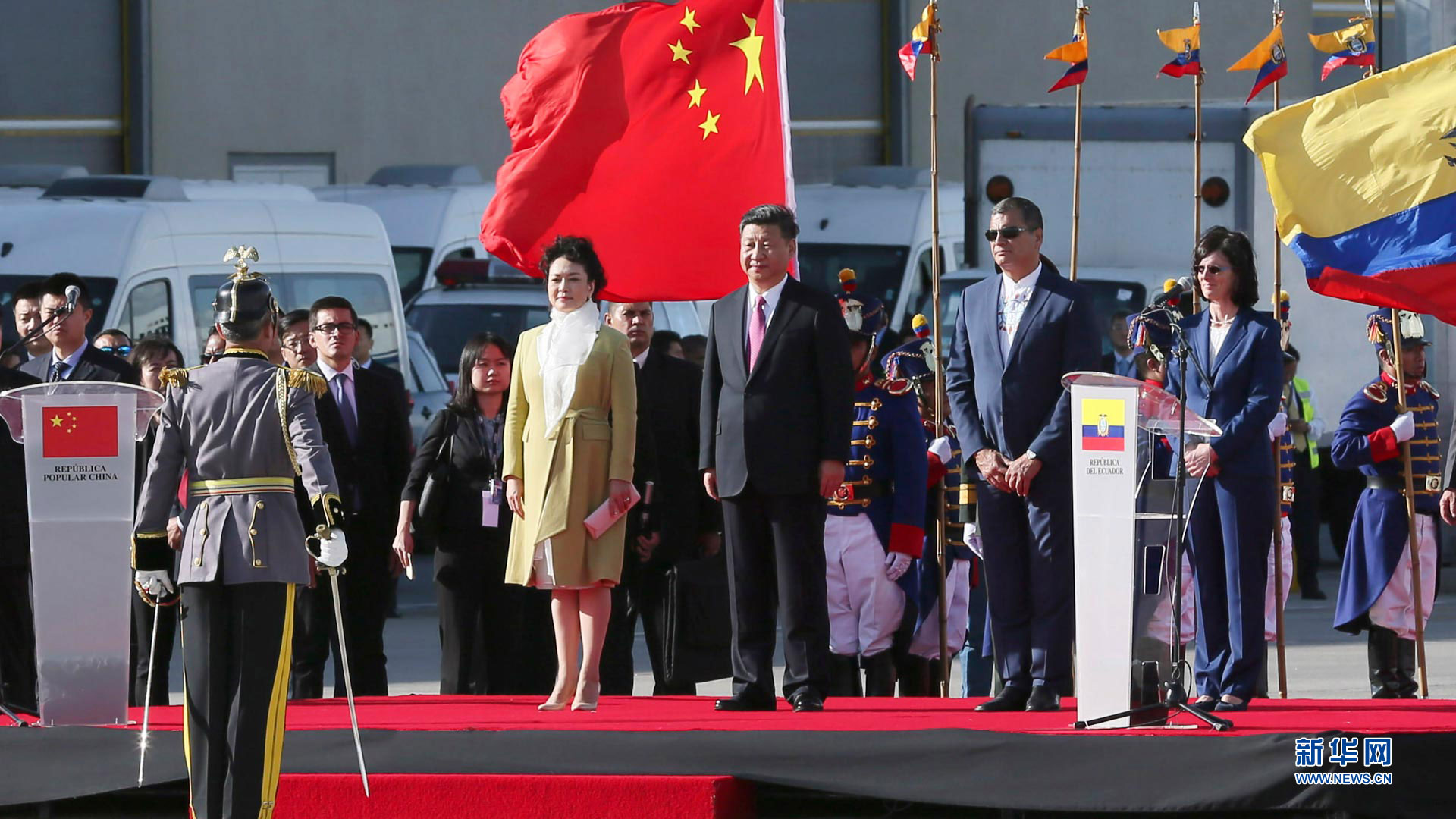 當(dāng)?shù)貢r(shí)間11月17日,國家主席習(xí)近平乘專機(jī)抵達(dá)基多,開始對(duì)厄瓜多爾共和國進(jìn)行國事訪問。這是厄瓜多爾總統(tǒng)科雷亞在機(jī)場為習(xí)近平舉行隆重歡迎儀式。新華社記者 蘭紅光 攝2016-11-18