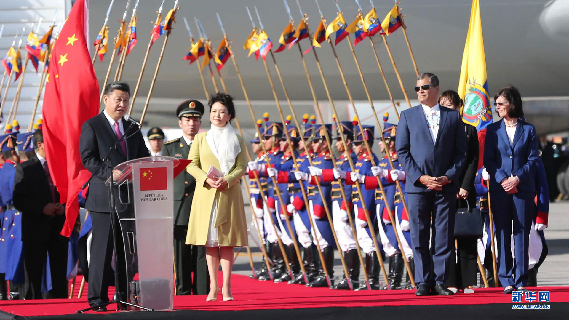 當(dāng)?shù)貢r(shí)間11月17日,國家主席習(xí)近平乘專機(jī)抵達(dá)基多,開始對(duì)厄瓜多爾共和國進(jìn)行國事訪問。厄瓜多爾總統(tǒng)科雷亞在機(jī)場為習(xí)近平舉行隆重歡迎儀式。這是習(xí)近平在歡迎儀式上致辭。新華社記者 馬占成 攝2016-11-18
