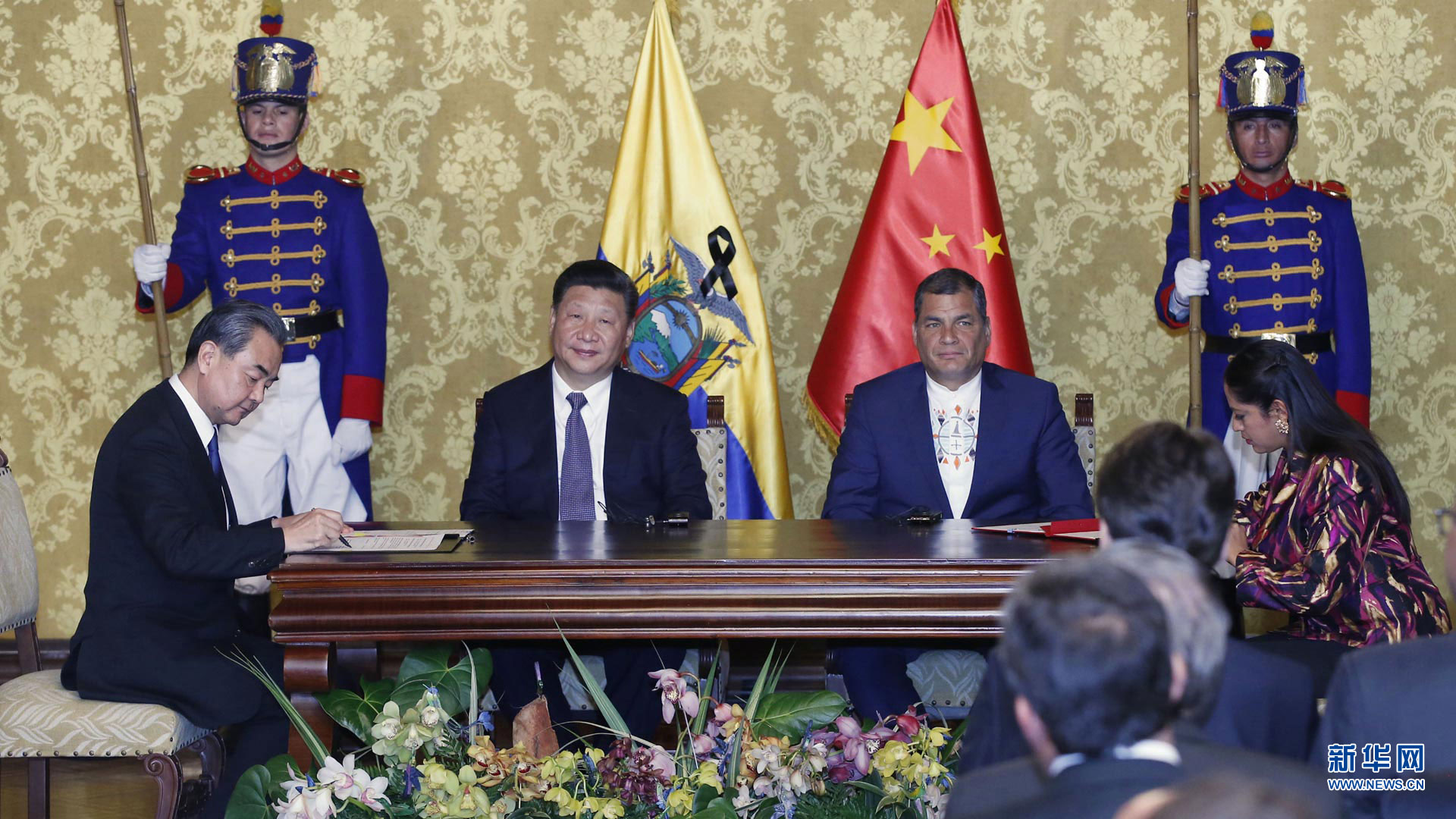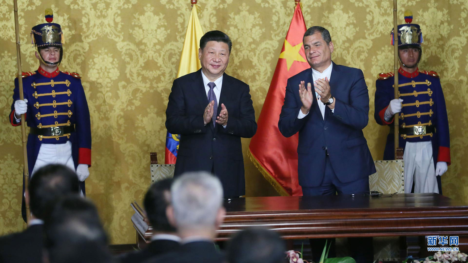 當(dāng)?shù)貢r(shí)間11月17日,國家主席習(xí)近平在基多同厄瓜多爾總統(tǒng)科雷亞舉行會(huì)談。這是會(huì)談后,兩國元首見證雙邊合作文件的簽署。 新華社記者 鞠鵬攝2016-11-18
