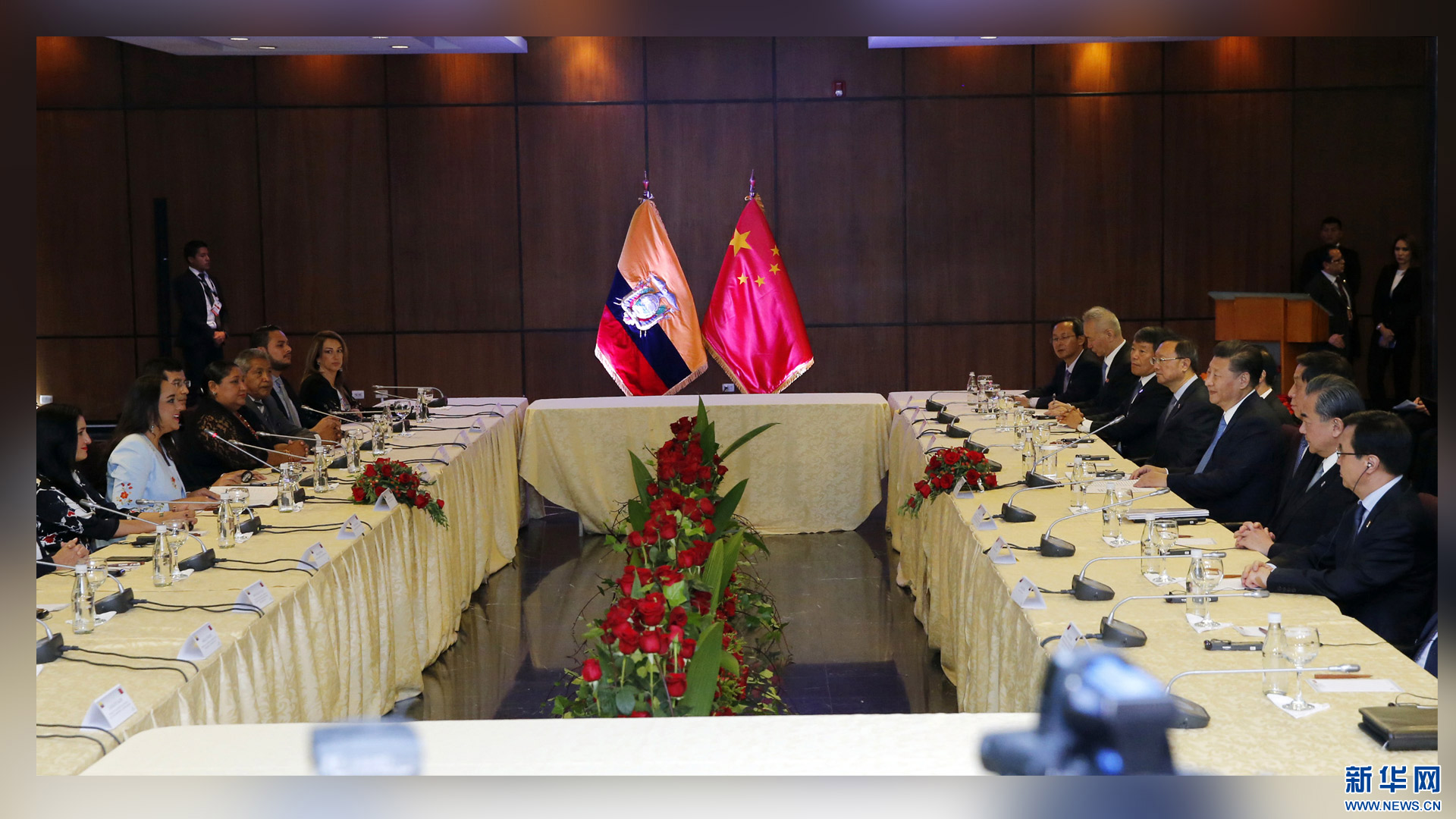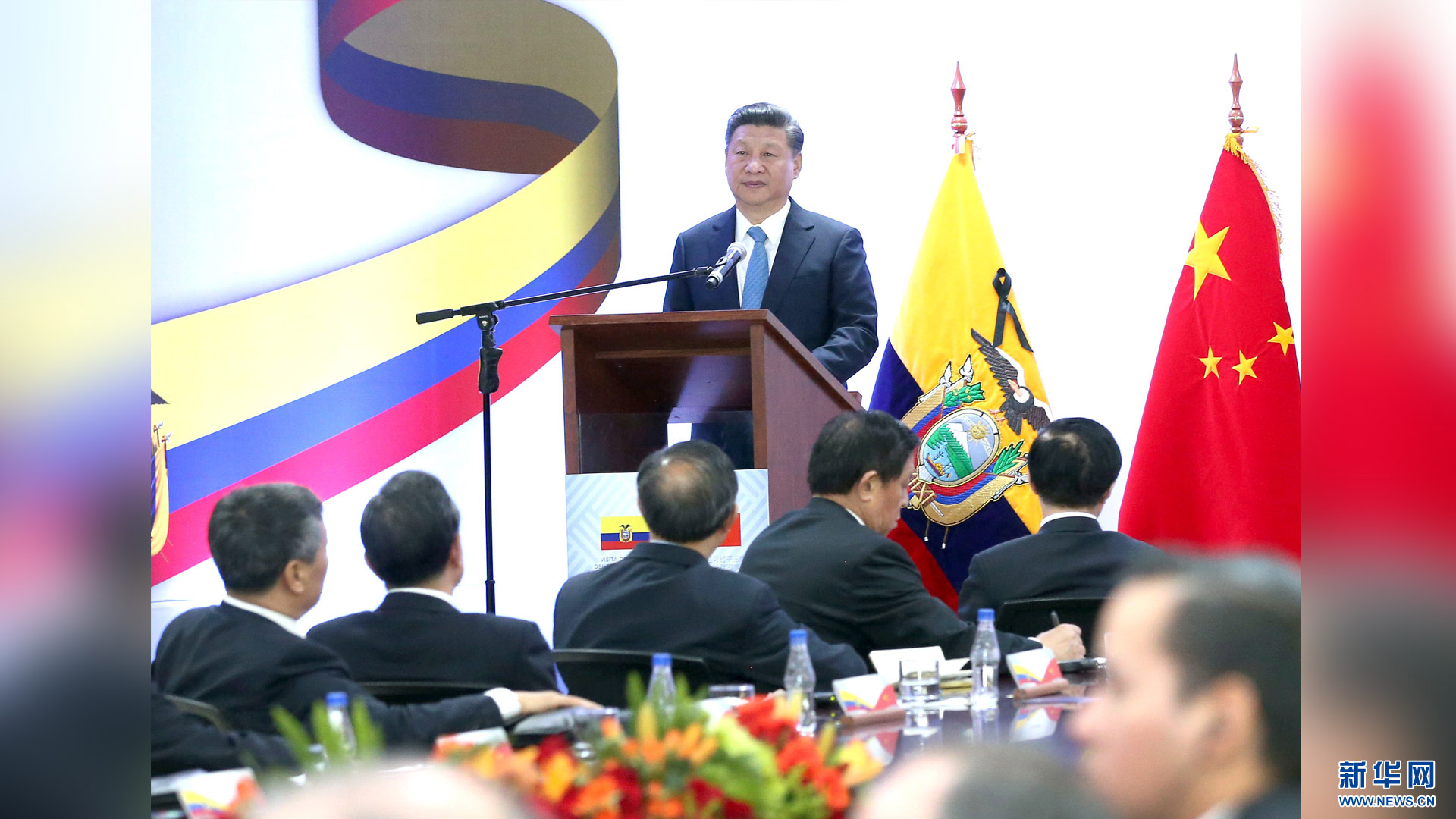 當(dāng)?shù)貢r(shí)間11月18日,國家主席習(xí)近平在基多同厄瓜多爾總統(tǒng)科雷亞共同出席中方援建的厄瓜多爾公共安全應(yīng)急指揮中心聯(lián)合實(shí)驗(yàn)室揭牌儀式,喬內(nèi)醫(yī)院奠基、科卡科多-辛克雷水電站竣工發(fā)電視頻連線活動(dòng)。這是習(xí)近平出席活動(dòng)后致辭。新華社記者 馬占成 攝2016-11-19