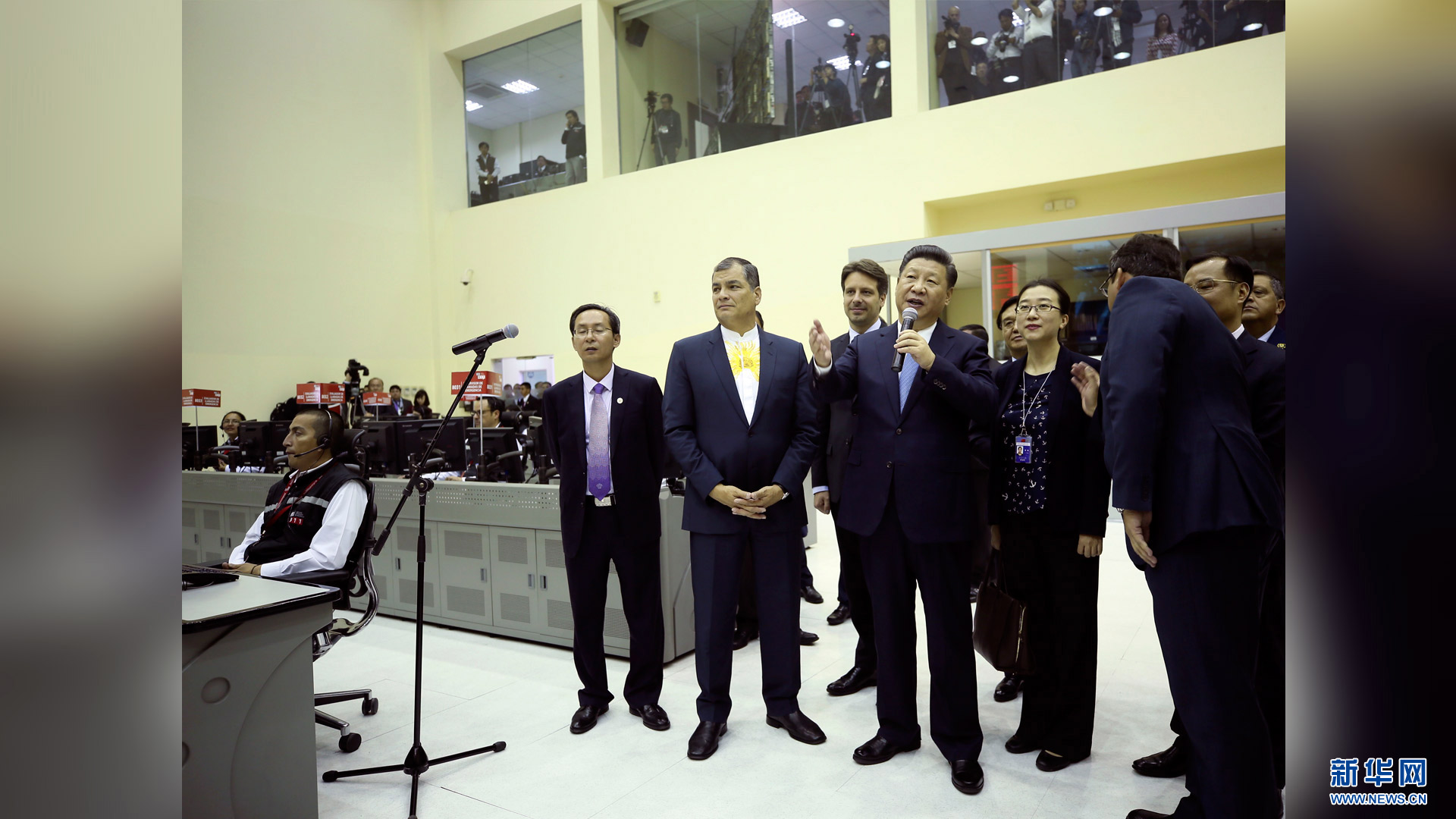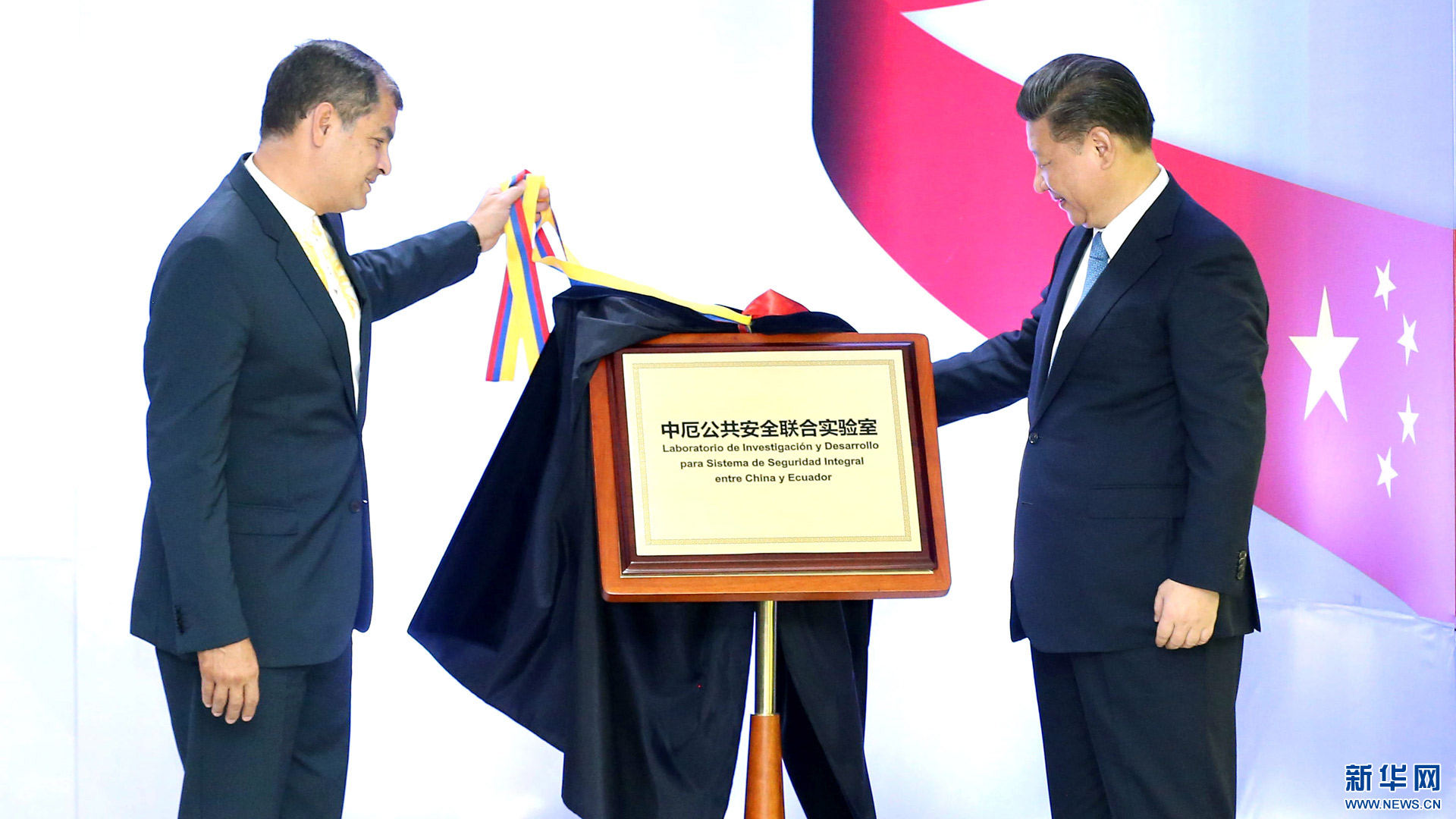 當(dāng)?shù)貢r(shí)間11月18日,國家主席習(xí)近平在基多同厄瓜多爾總統(tǒng)科雷亞共同出席中方援建的厄瓜多爾公共安全應(yīng)急指揮中心聯(lián)合實(shí)驗(yàn)室揭牌儀式,喬內(nèi)醫(yī)院奠基、科卡科多-辛克雷水電站竣工發(fā)電視頻連線活動(dòng)。這是兩國元首共同為厄瓜多爾公共安全應(yīng)急指揮中心聯(lián)合實(shí)驗(yàn)室揭牌。新華社記者 馬占成 攝2016-11-19